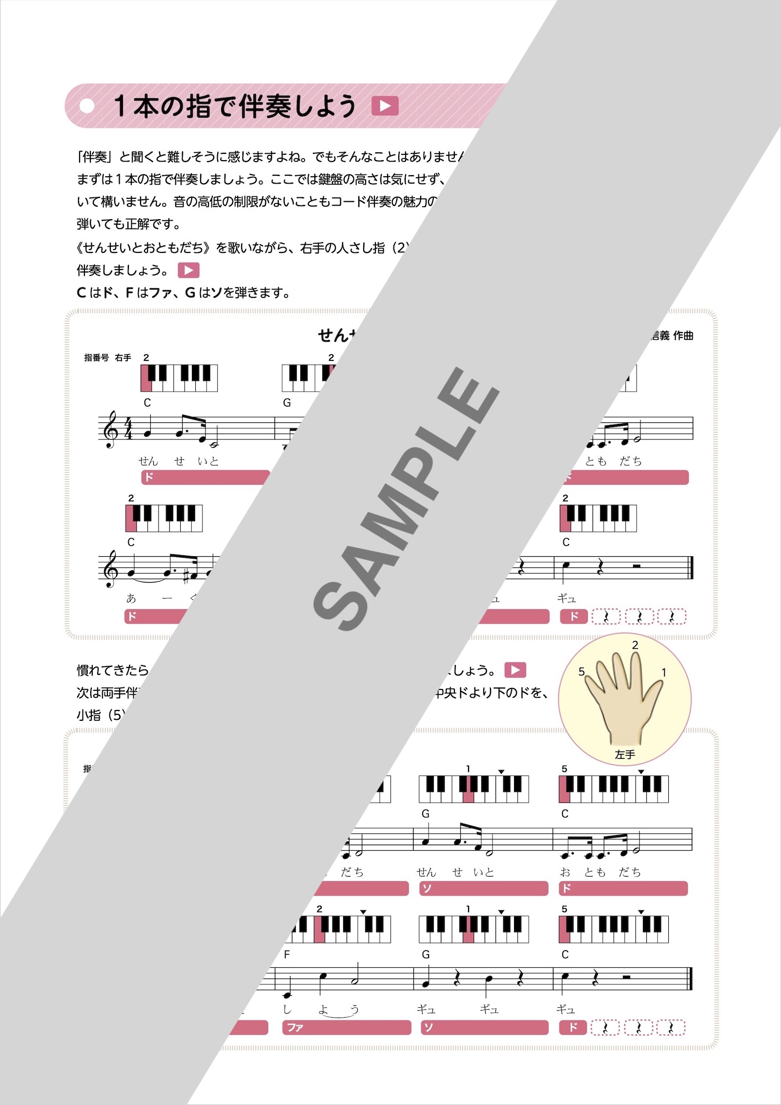○《せんせいとおともだち》の「1本指伴奏」から「両手伴奏」まで習得できれば、他の曲にも即対応可能。