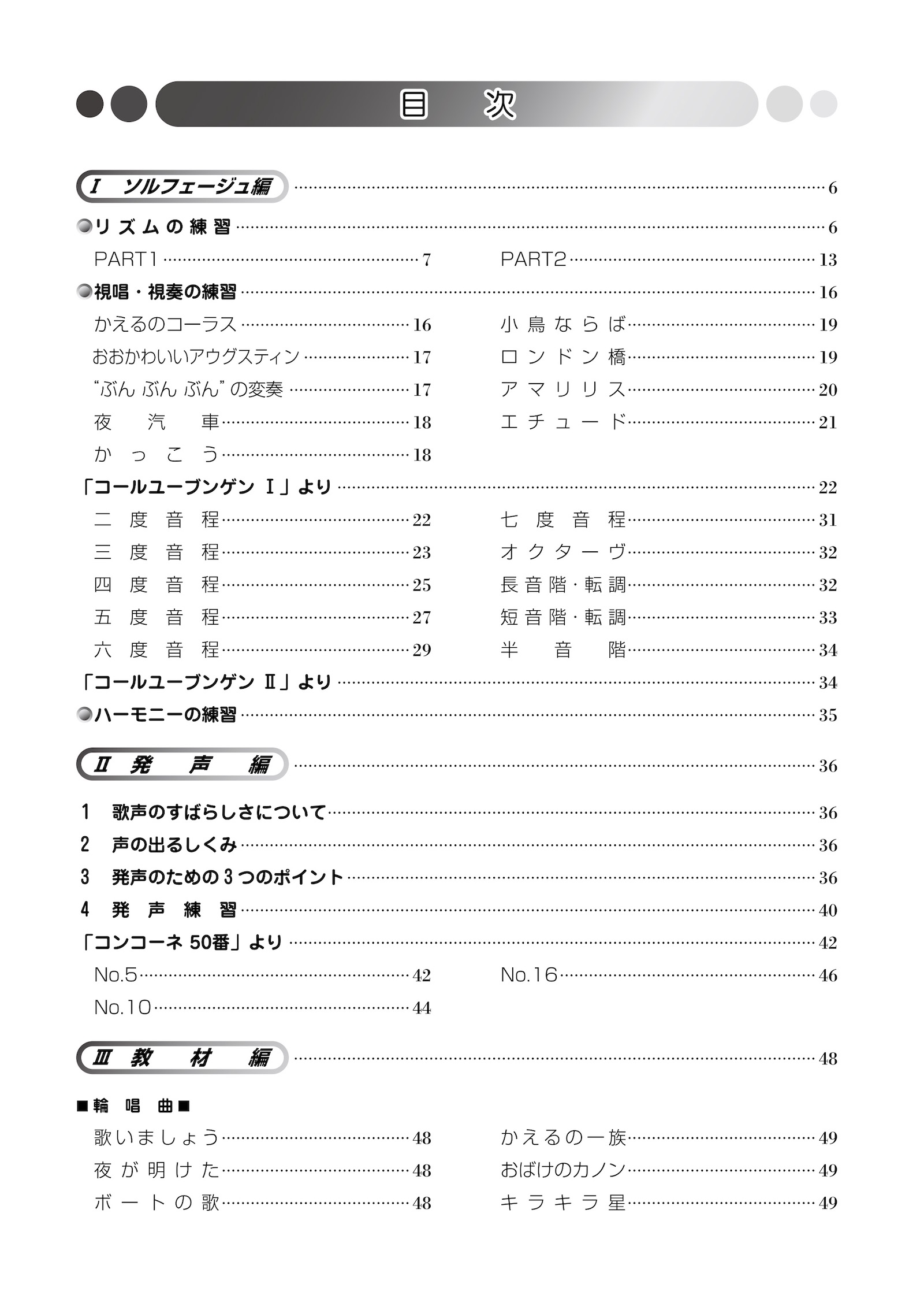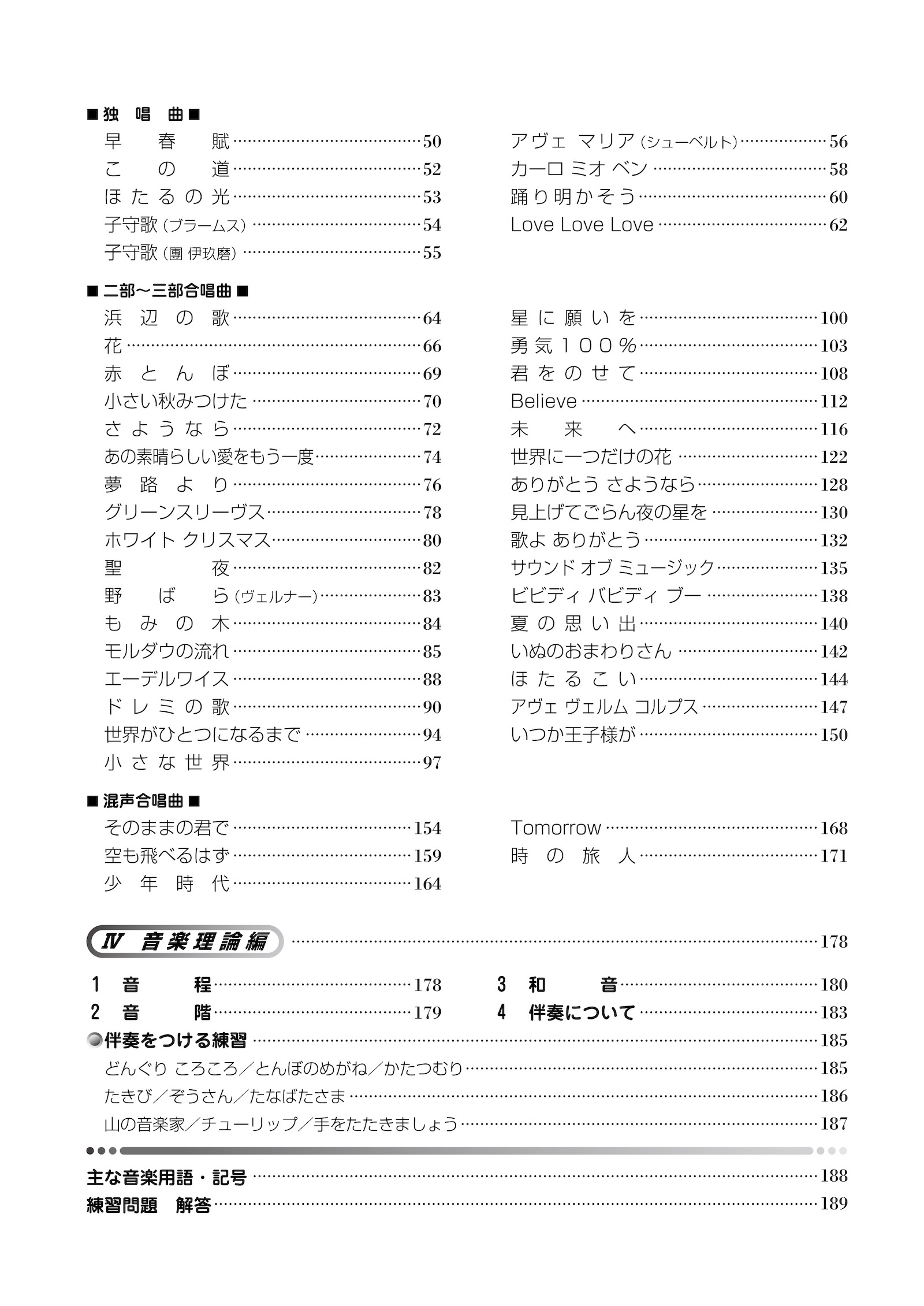○〈教材編〉は輪唱をはじめ、独唱、同声合唱、混声合唱など、魅力的な教材(全53曲)を収録。