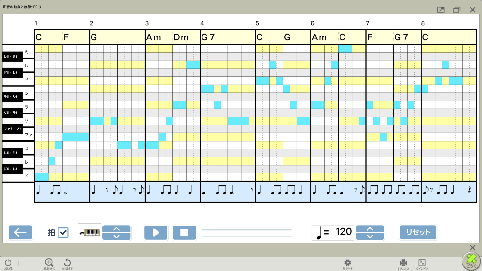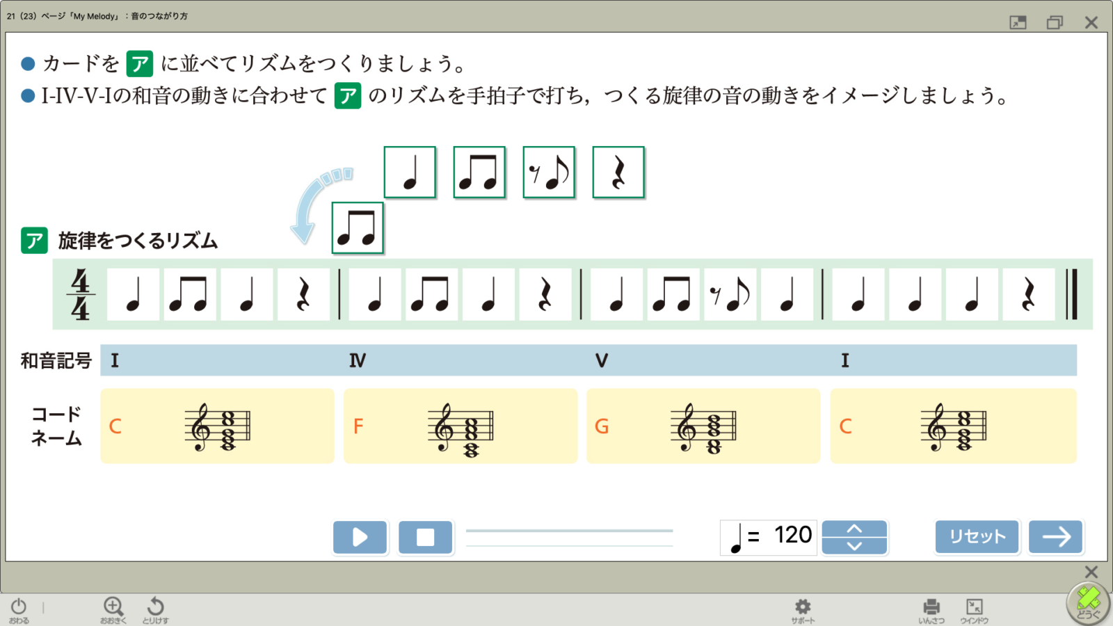 和音の動きを考えながらコードを選び、次の画面ではリズムと音を入力して旋律づくりの活動ができます。