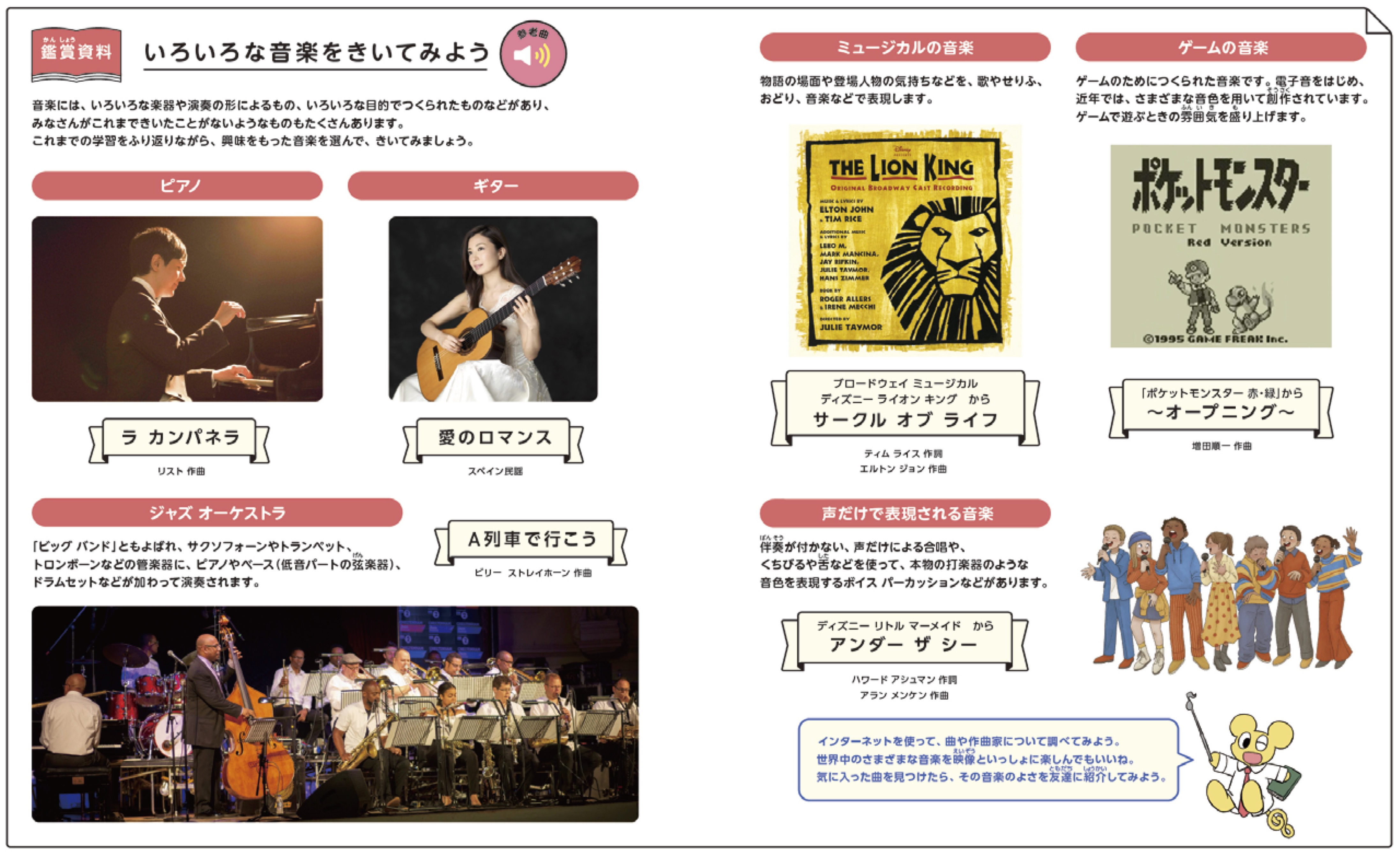 「いろいろな音楽をきいてみよう」では、楽器や演奏形態、ジャンルの異なるさまざまな音楽を掲載しています。各題材で扱う教材では、「目的をもって聴き深めること」を中心に学習しますが、ここでは、「幅広くいろいろな音楽に出会うこと」を意図しています。