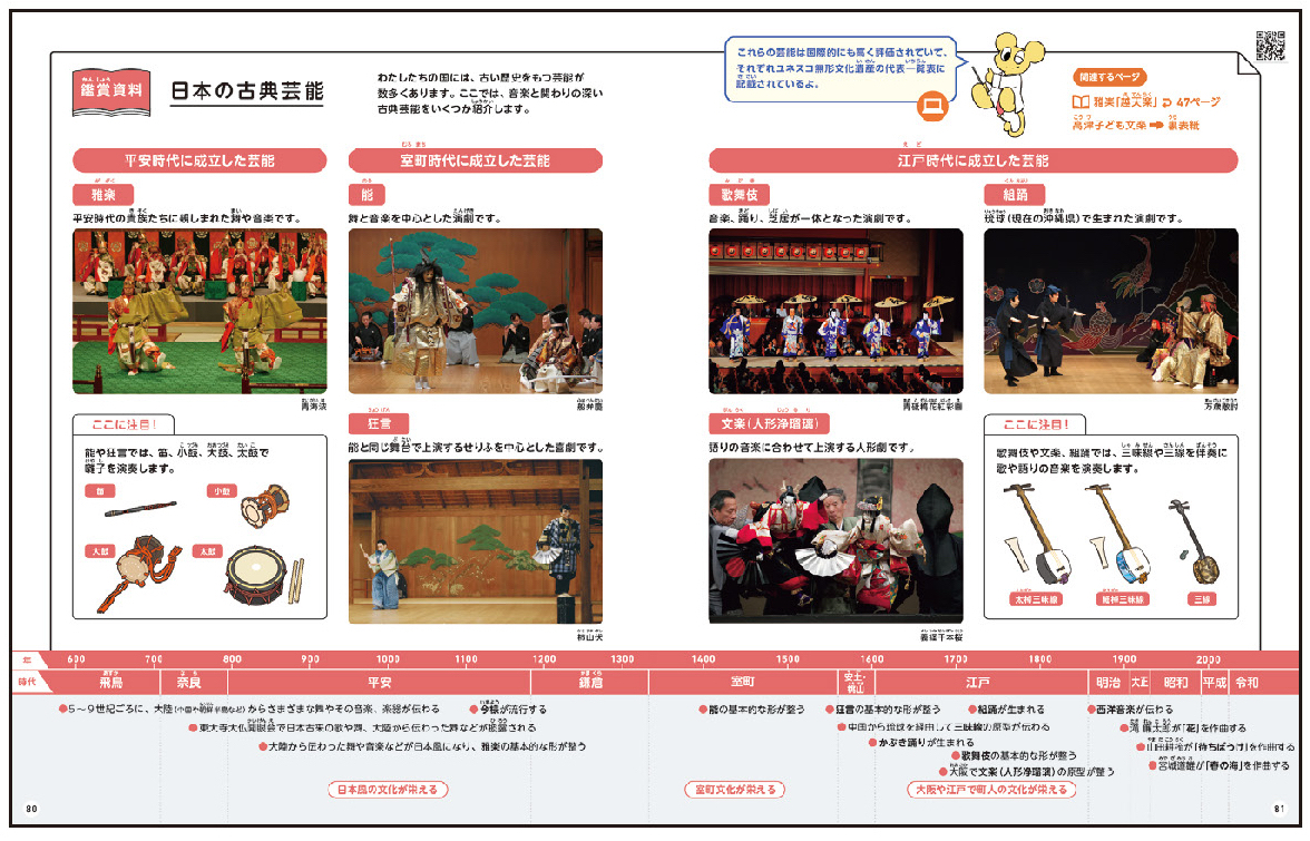 「日本の古典芸能」では、我が国に伝わる伝統芸能の中から、雅楽、能楽(能・狂言)、歌舞伎、文楽(人形浄瑠璃)、組踊を取り上げています。これらは中学校の音楽で本格的に学習しますが、小学校では他教科との関連を図りながら、各芸能の導入として紹介しています。