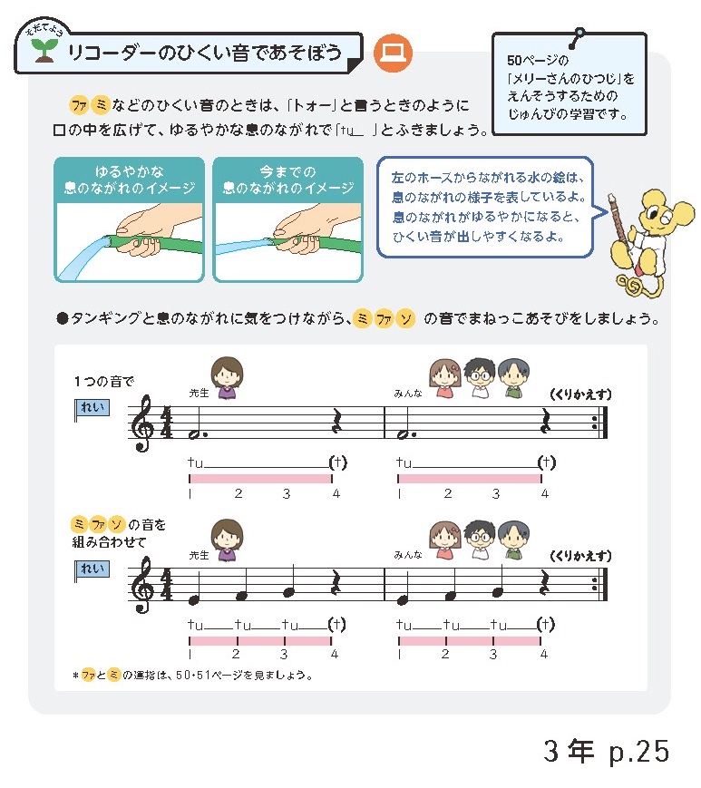 1〜4年生には発達段階や学習内容に応じた活動を掲載しました。鍵盤ハーモニカやリコーダーを活用した「常時活動」は、次の学習にもつながるウォーミングアップを兼ねています。
