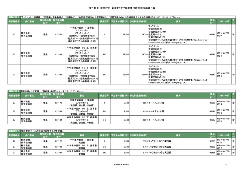 教師用指導書の価格・対応教科書番号 PDF A4横 PDF A4縦