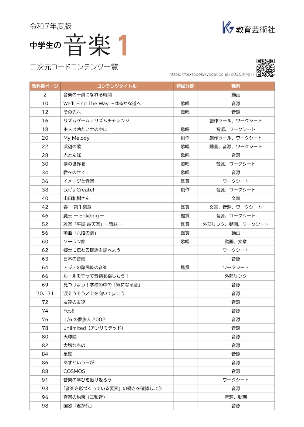 内容解説資料| 検討の観点別に見た特色| 二次元コード コンテンツ一覧| 掲載教材一覧| 編修趣意書| 年間学習指導計画作成資料(題材の評価規準例を含む)| 教師用指導書の価格・対応教科書番号