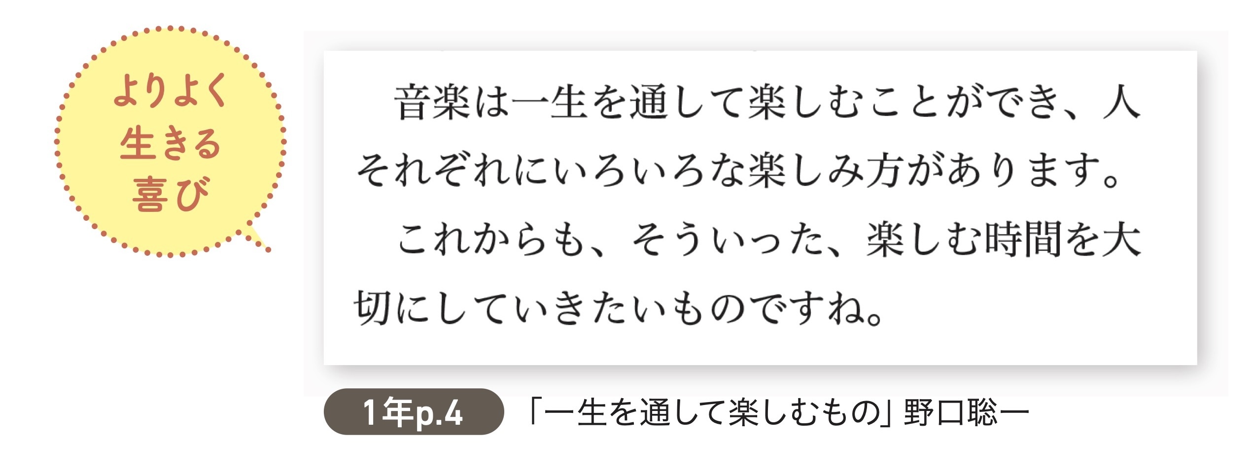 互いの人権を尊重し合うこと、つまり「自分の大切さとともに他の人の大切さを認めること」は、人権教育の理念でもあります。教科書で取り上げている楽曲の歌詞の内容や写真については、道徳教育や人権教育の観点に立って、十分に吟味して選んでいます。生徒たちが自分自身のよさや可能性を認識して個性を生かしながら、多様な他者を価値ある存在として尊重し、協働していくことができるよう配慮しました。