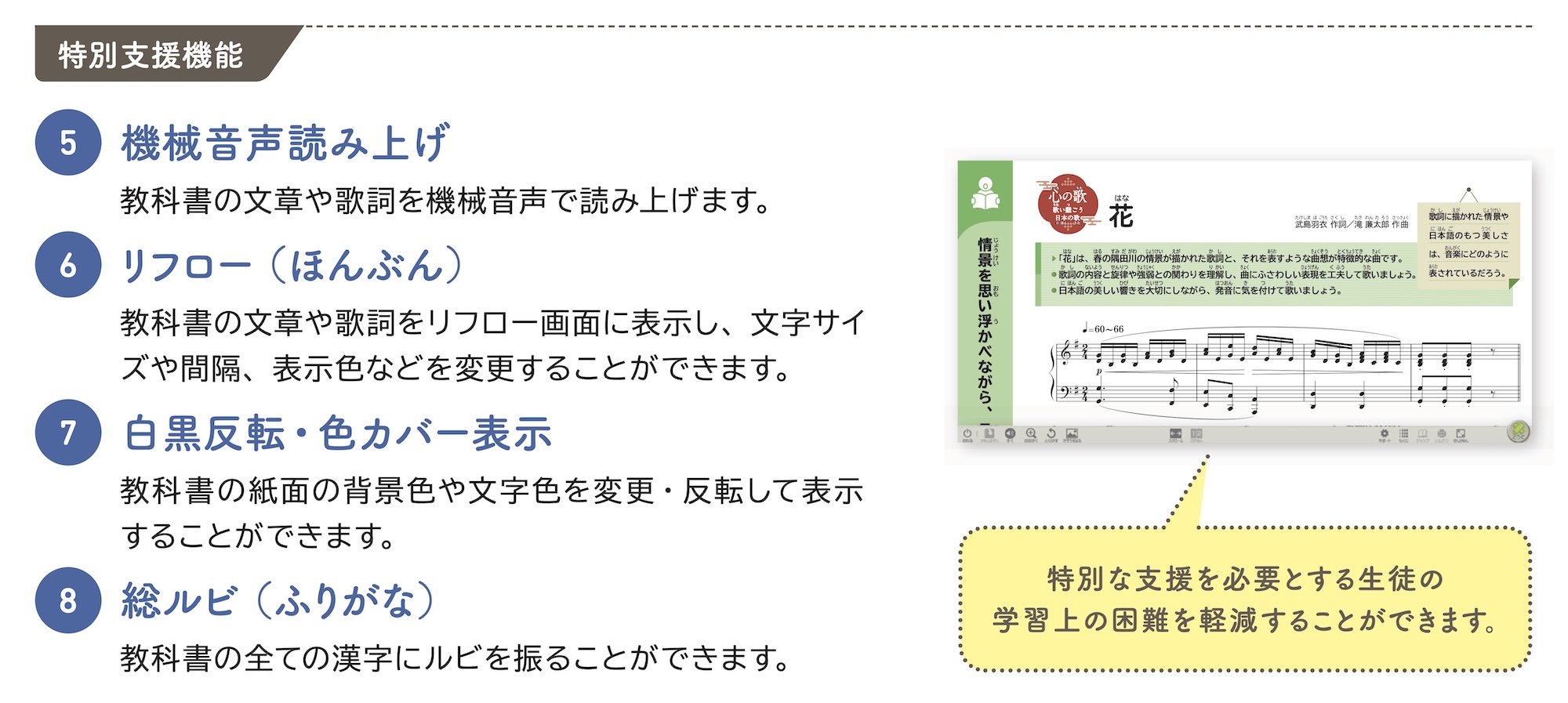 教科書に掲載されている全ての要素を、見やすい大きさと配色によって、学習の順序を追いながら適切に配置しています。