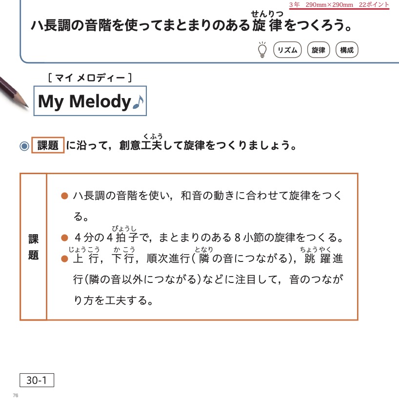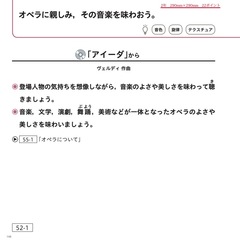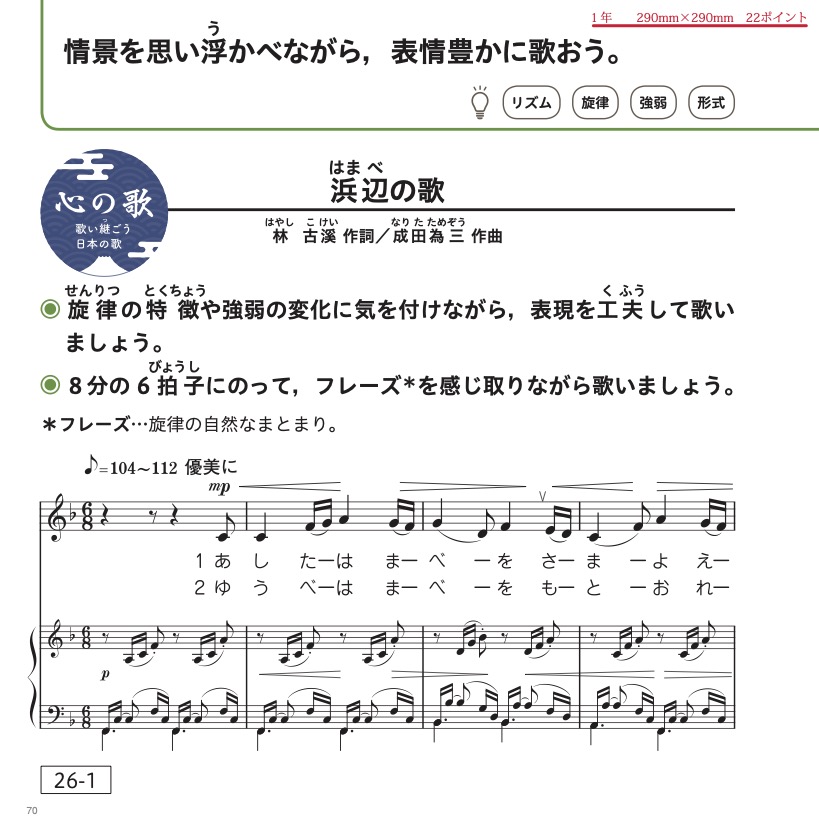 *教育芸術社の拡大教科書は,教科書に掲載されているすべての要素を,見やすい大きさと配色によって,学習の順序を追いながら適切に配置しています。 特に,楽譜や歌詞,絵譜などを見やすく,かつ見通しをもって読み取ることができるように,290ミリ ✕ 290ミリという判型を採用しているのが特徴です。